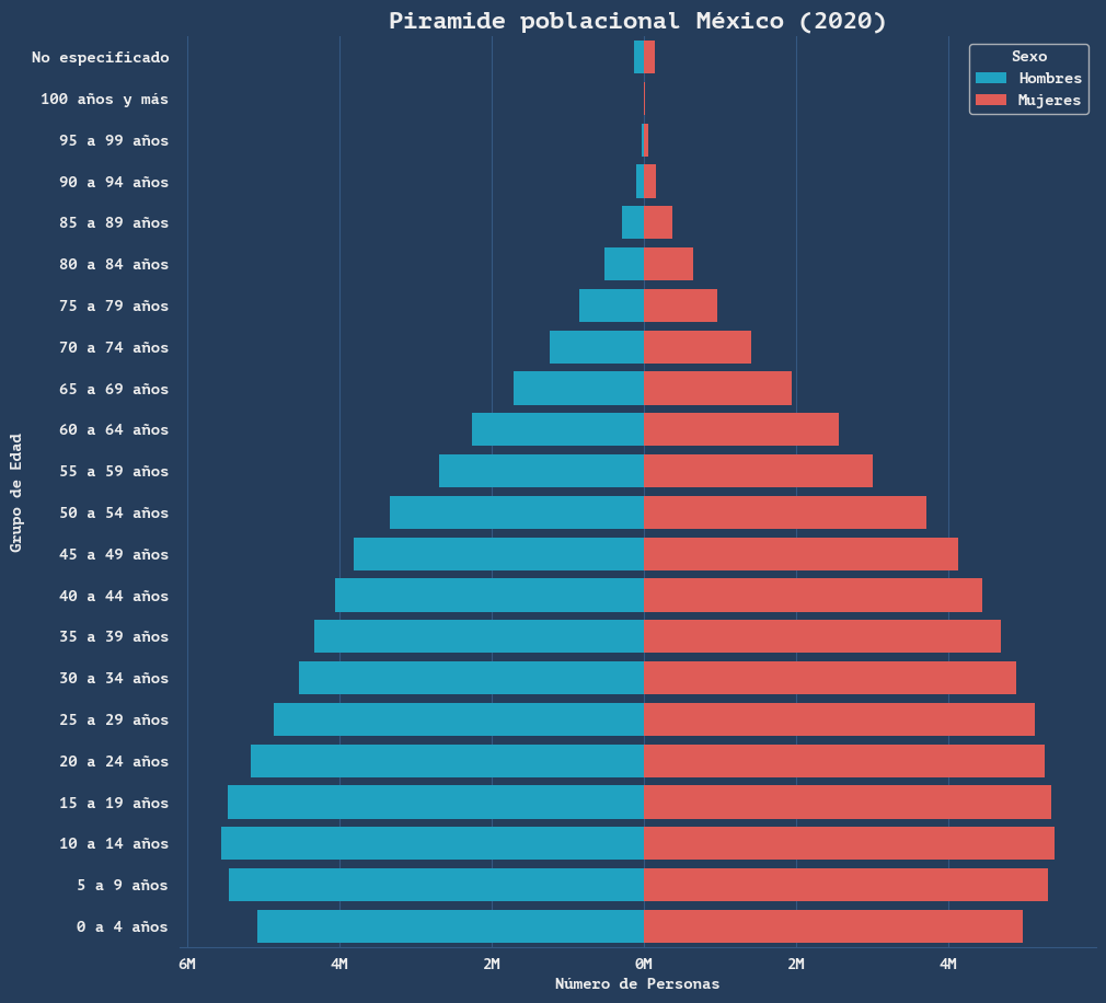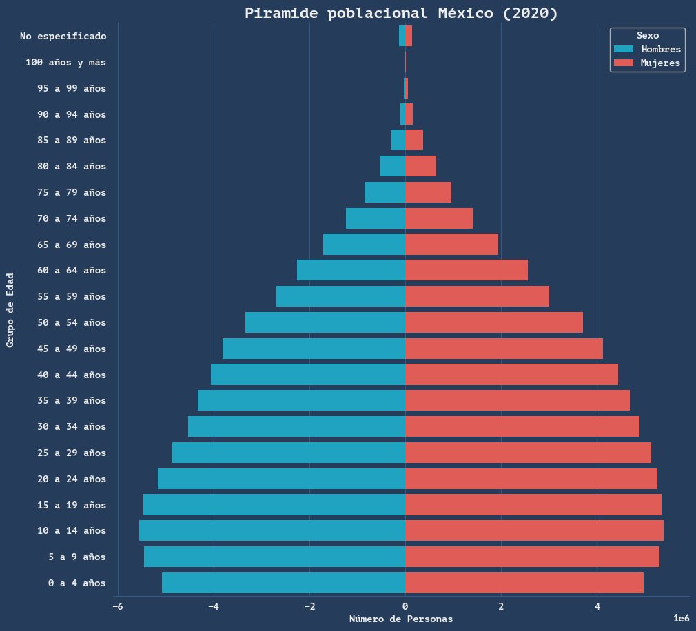 Primero crearemos un gráfico básico para visualizar la pirámide poblacional de México. Filtramos los datos para obtener solo los registros correspondientes a “Estados Unidos Mexicanos”, además de eliminar el grupo de edad “Total”: