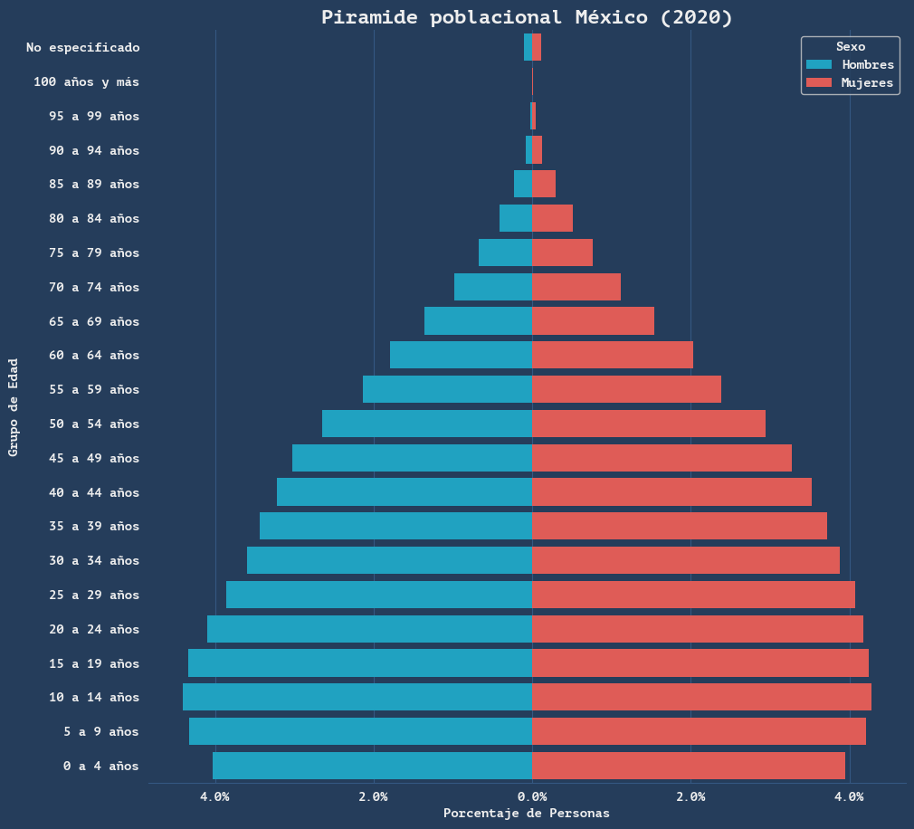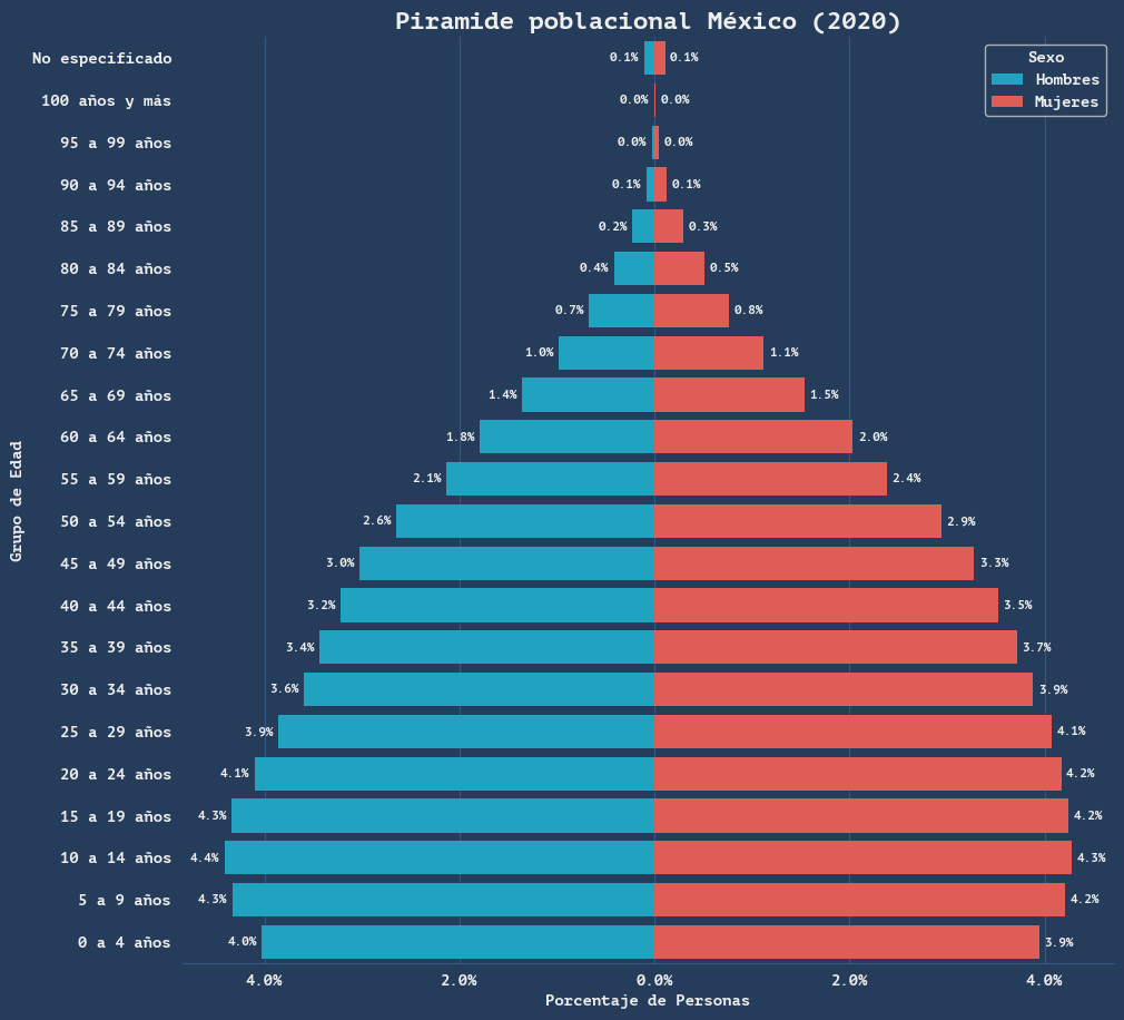 Otra forma útil de visualizar la pirámide poblacional es mediante porcentajes en lugar de números absolutos. Esto permite comparar la distribución de edades entre diferentes poblaciones o estados sin importar el tamaño total de la población. Para lograr esto, primero calculamos el porcentaje de hombres y mujeres en cada grupo de edad con respecto al total nacional: